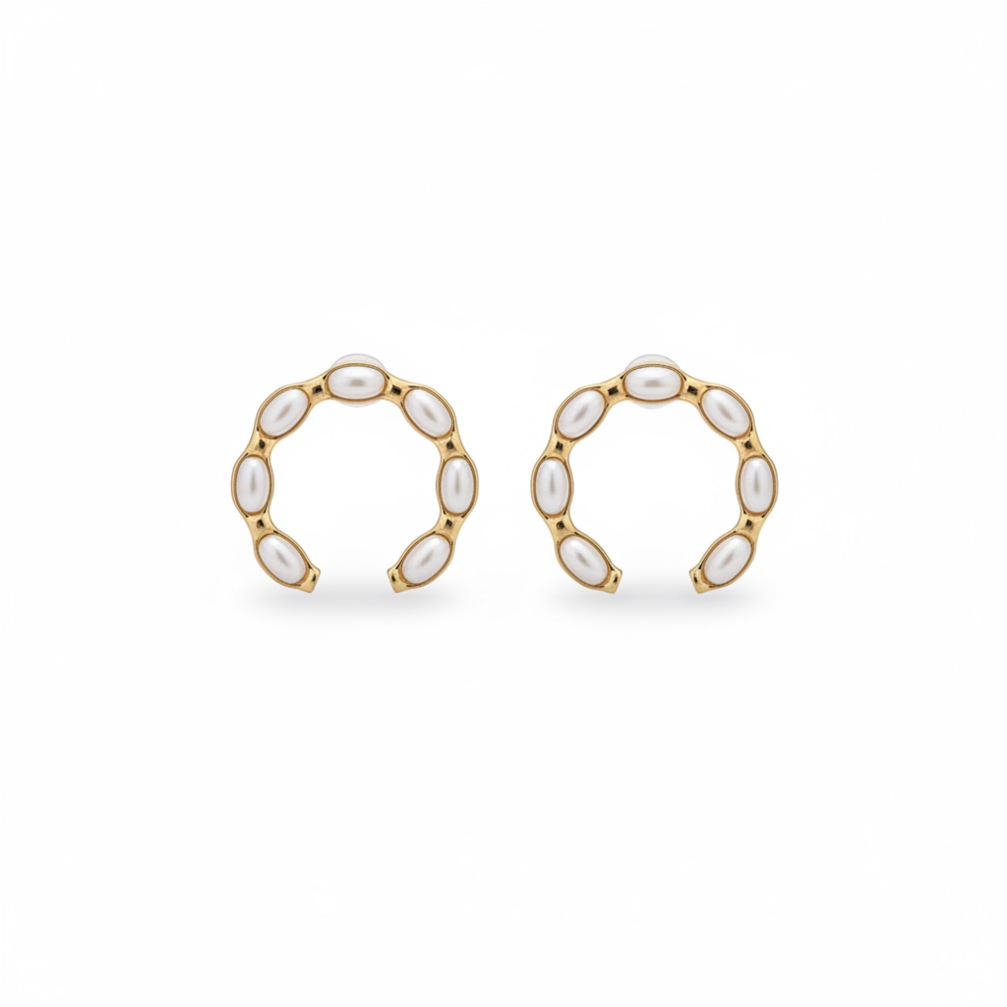 The open circular design offers a contemporary twist on traditional pearl jewelry, while the evenly spaced pearl accents add dimension, texture, and brilliance. Lightweight and effortlessly wearable, these earrings elevate everything from minimalist daytime looks to evening ensembles.